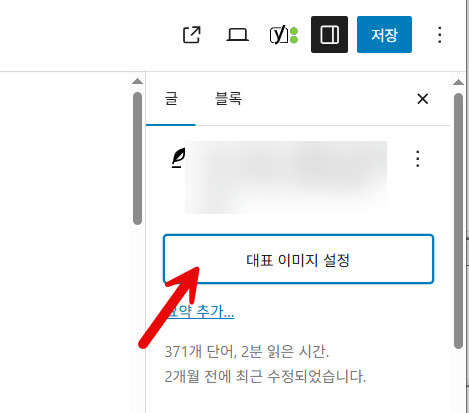 글 작성 또는 편집 화면에서 오른쪽 패널의 대표 이미지 설정 버튼을 눌러 대표 이미지를 지정할 수 있습니다.
