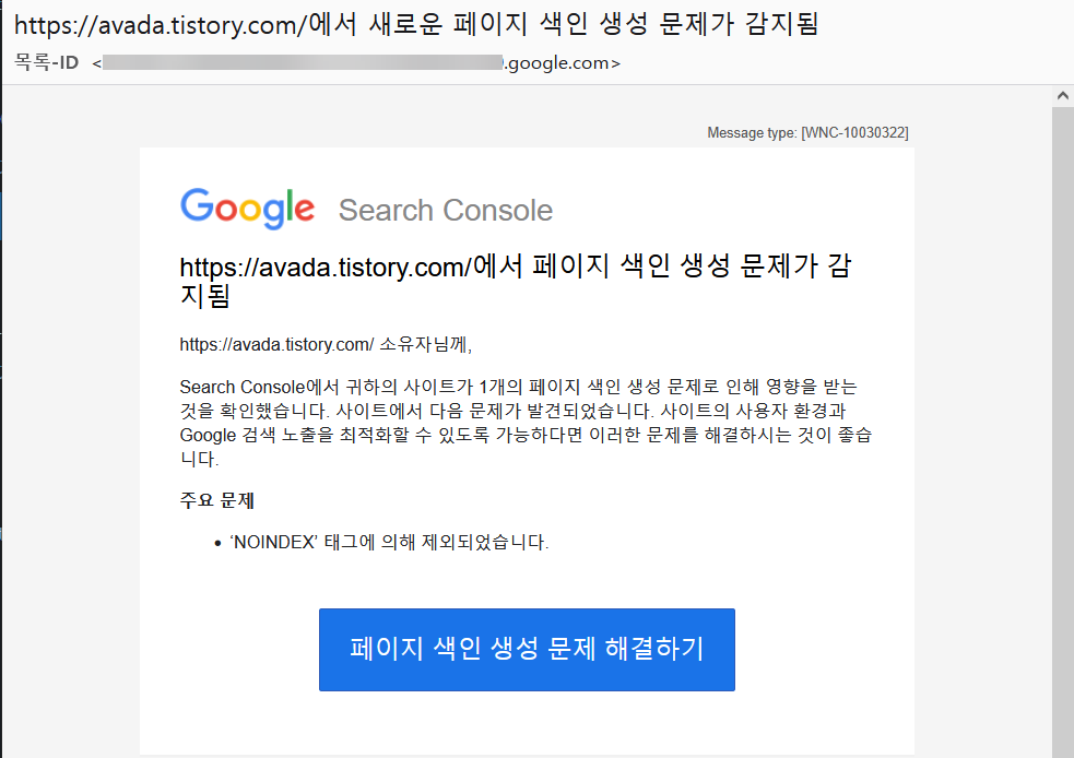 티스토리나 워드프레스 블로그를 구글 서치 콘솔에 등록하면 수시로 '새로운 페이지 색인 생성 문제가 감지됨' 메일이 날아옵니다. 아래 그림은 'NOINDEX’ 태그에 의해 제외되었습니다 문제로 인한 색인 생성 문제가 감지되었음을 알리는 메일입니다.