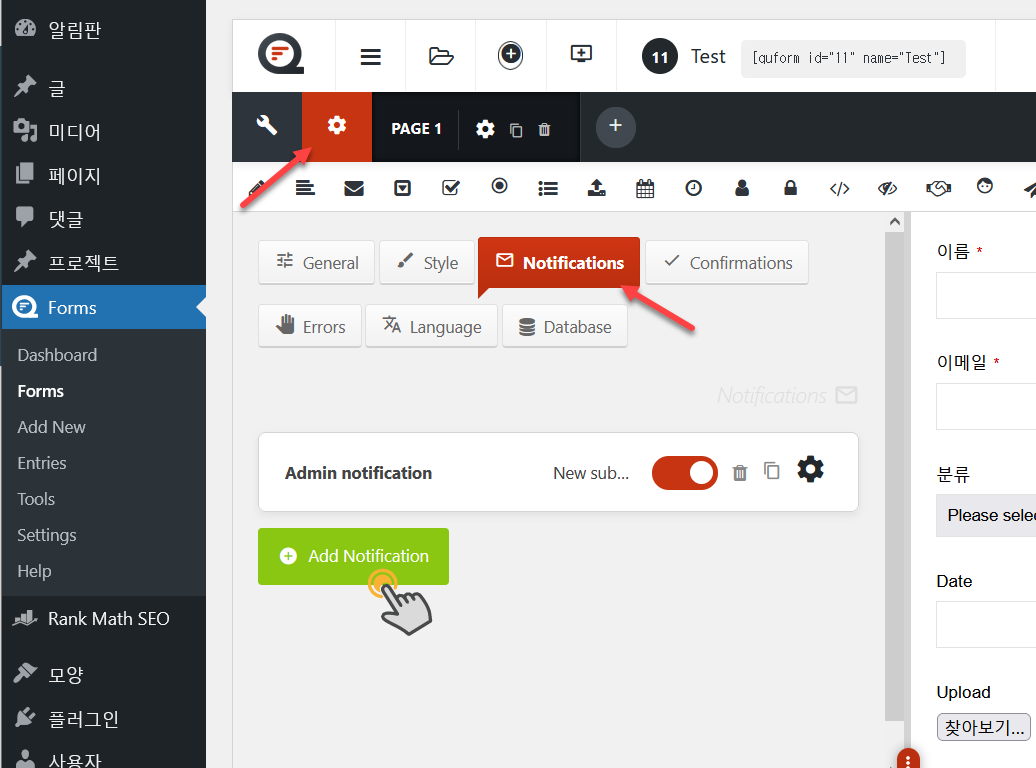 문의 폼 편집 화면에서 Email Notifications을 선택하고 Add Email Notification을 클릭하여 새로운 이메일 알림을 설정할 수 있습니다.