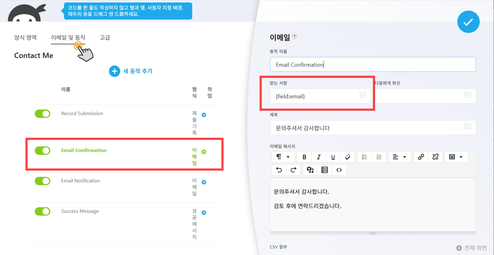 닌자 폼에서는 이메일 및 동작 탭의 Email Confirmation(이메일 확인) 옵션을 활성화하여 사용자에게 자동 회신 메일을 보내도록 설정할 수 있습니다.