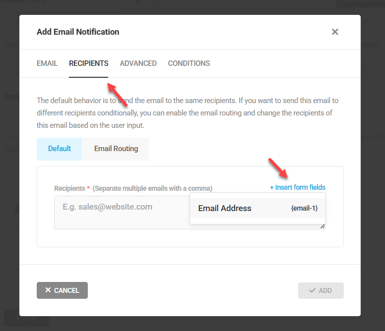 Recipients 탭에서 수신자 이메일을 지정할 수 있습니다. Inserter from fields를 누르고 Email Address를 선택하면 사용자가 읿력한 이메일로 알림이 전송됩니다.