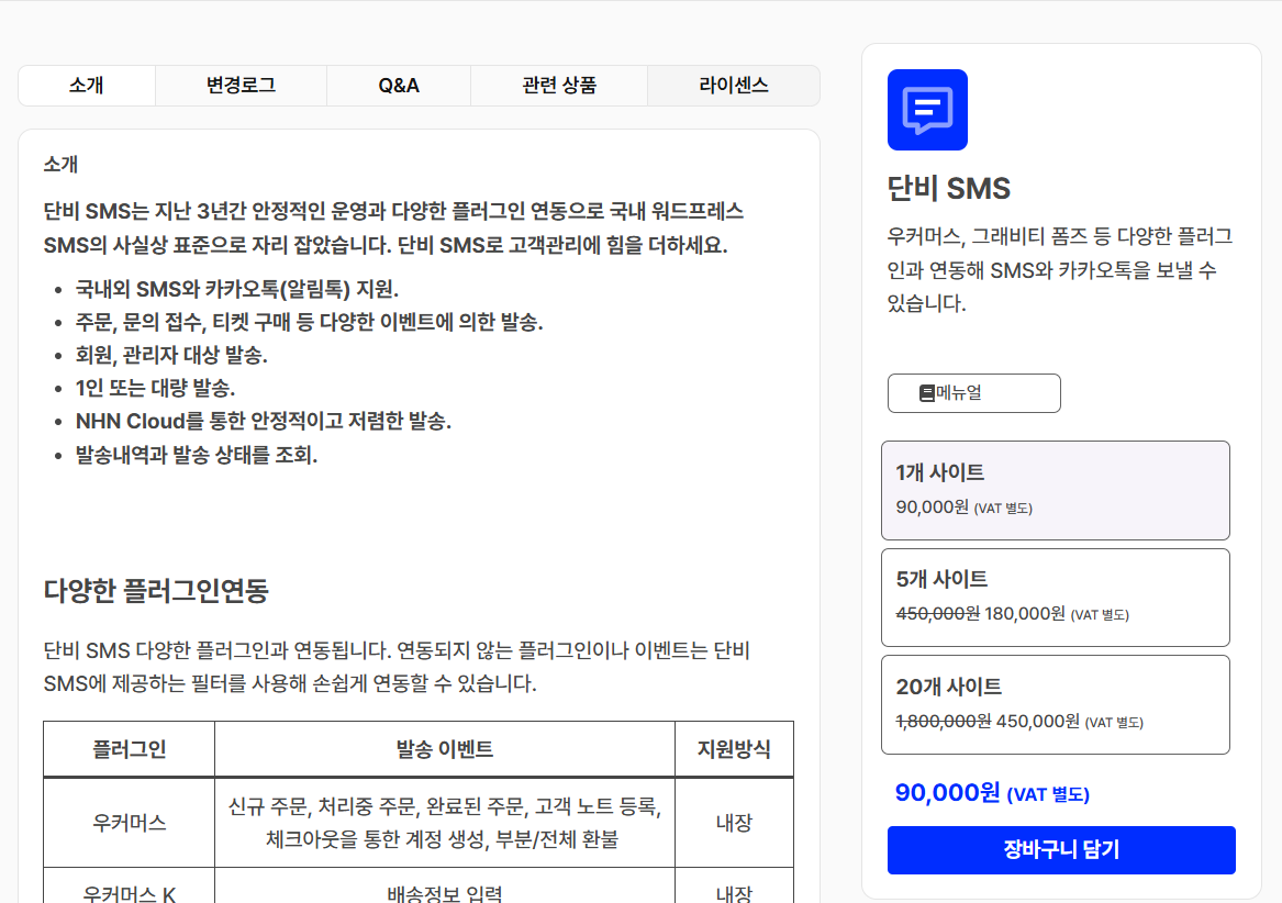 쿨에스엠스(CoolSMS)를 이용하는 경우 한 번 연동 작업을 한 후에 플러그인 사용으로 인한 추가적인 비용이 없어 괜찮은 선택인 것 같습니다. 단비 SMS의 경우 연간 비용이 발생하고 사이트 개수에 따라 비용이 증가합니다.