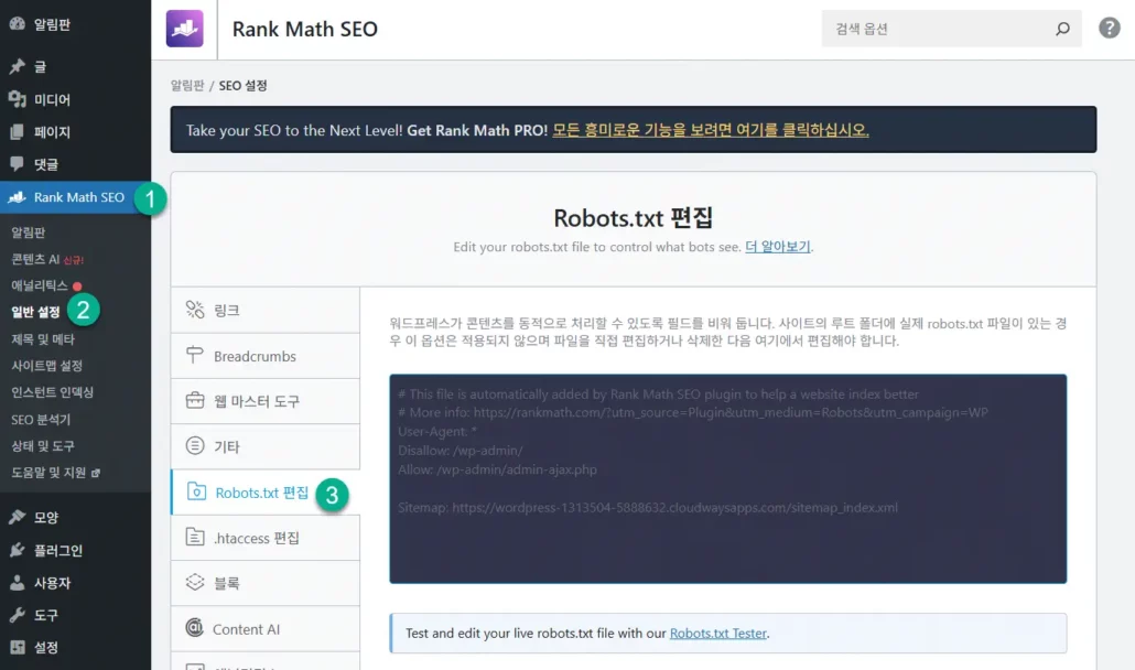 Rank Math 플러그인을 사용하는 경우에도 Rank Math에서 제공하는 robots.txt 파일 편집 기능을 사용할 수 있습니다.