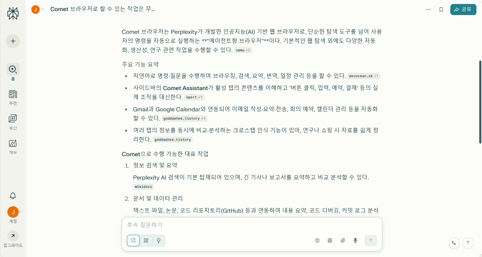 Perplexity에서 출시한 Comet 브라우저를 설치하고 첫 검색을 하면 Perplexity pro가 1개월 무료라고 하여 Comet를 설치해보았습니다. 그냥 Comet을...