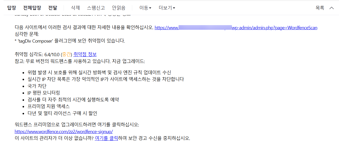 Wordfence 보안 플러그인이 설치되어 있으면 업데이트가 안 된 플러그인이 있거나, 보안 취약점이 발견된 테마나 플러그인이 설치되어 있다면 보안 경고 메일로 위험성에 대하여 경고해 줍니다.