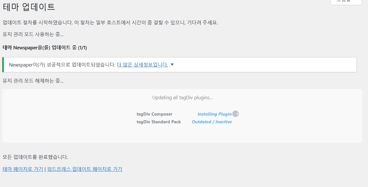 Install update 버튼을 누르면 테마와 관련 플러그인이 자동으로 업데이트됩니다.