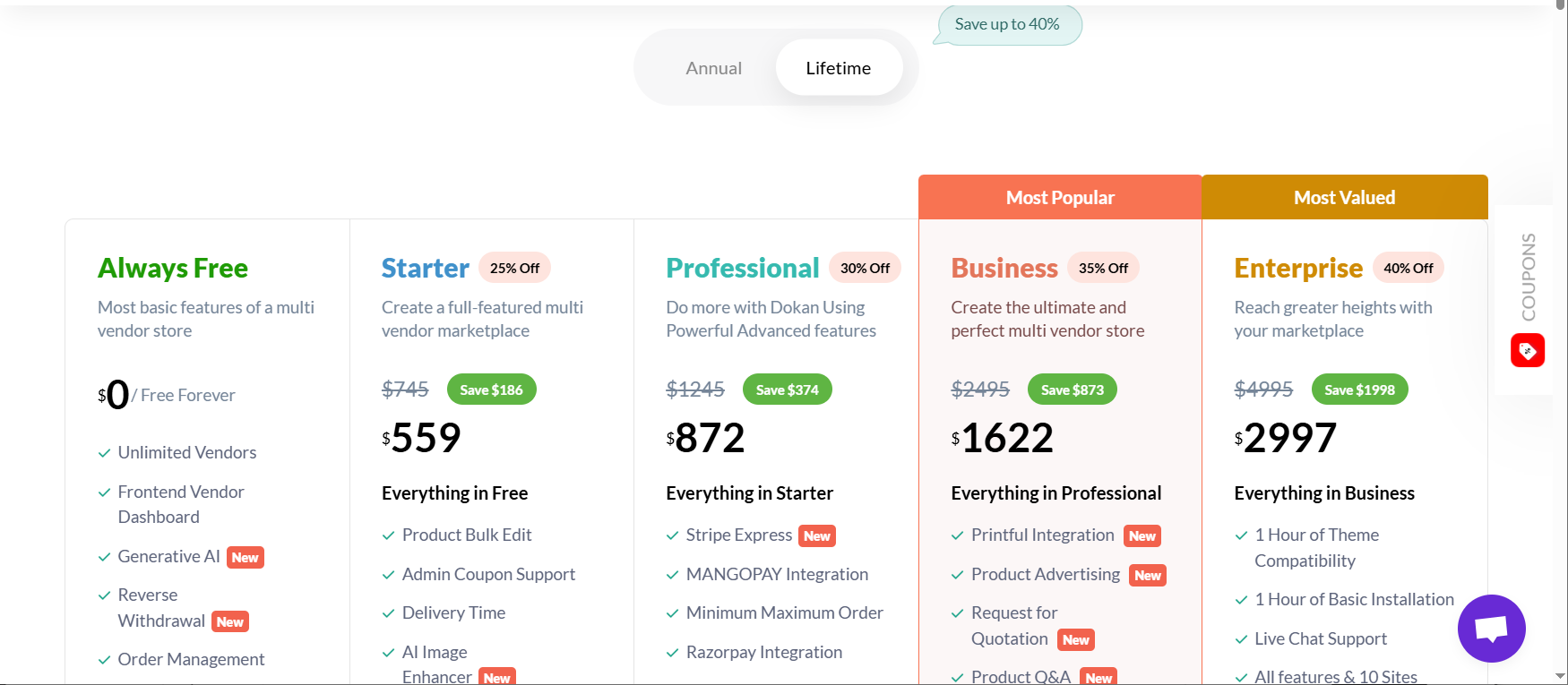 도칸은 기본적인 멀티벤더 마켓플레이스 기능을 무료로 제공하지만, 프로 버전은 고급 판매자 관리, 보고서, 쿠폰 기능, 세금 및 배송 관리, 라이브 채팅, 상품 구독 등 다양한 고급 기능을 포함합니다. 비즈니스가 성장함에 따라 필요에 맞춰 프로 버전을 도입할 수 있어 비용 효율적입니다.
