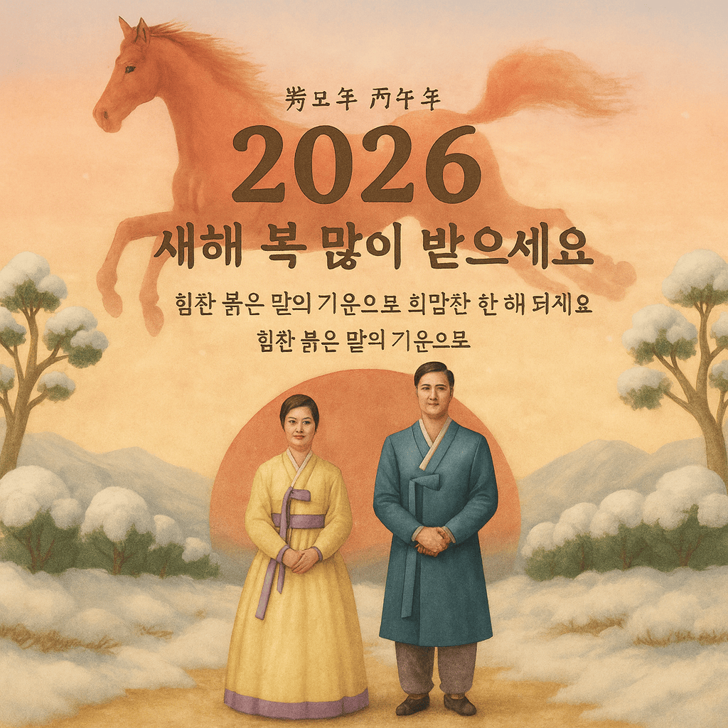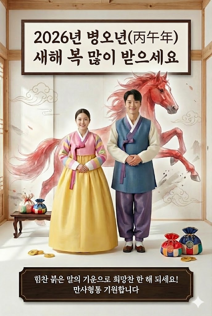 테스트로 챗GPT Plus와 Gemini Pro에서 각각 동일한 참고 이미지를 업로드하고 그것을 바탕으로 2026년 새해 인사말 이미지 생성을 요청해 보았습니다.