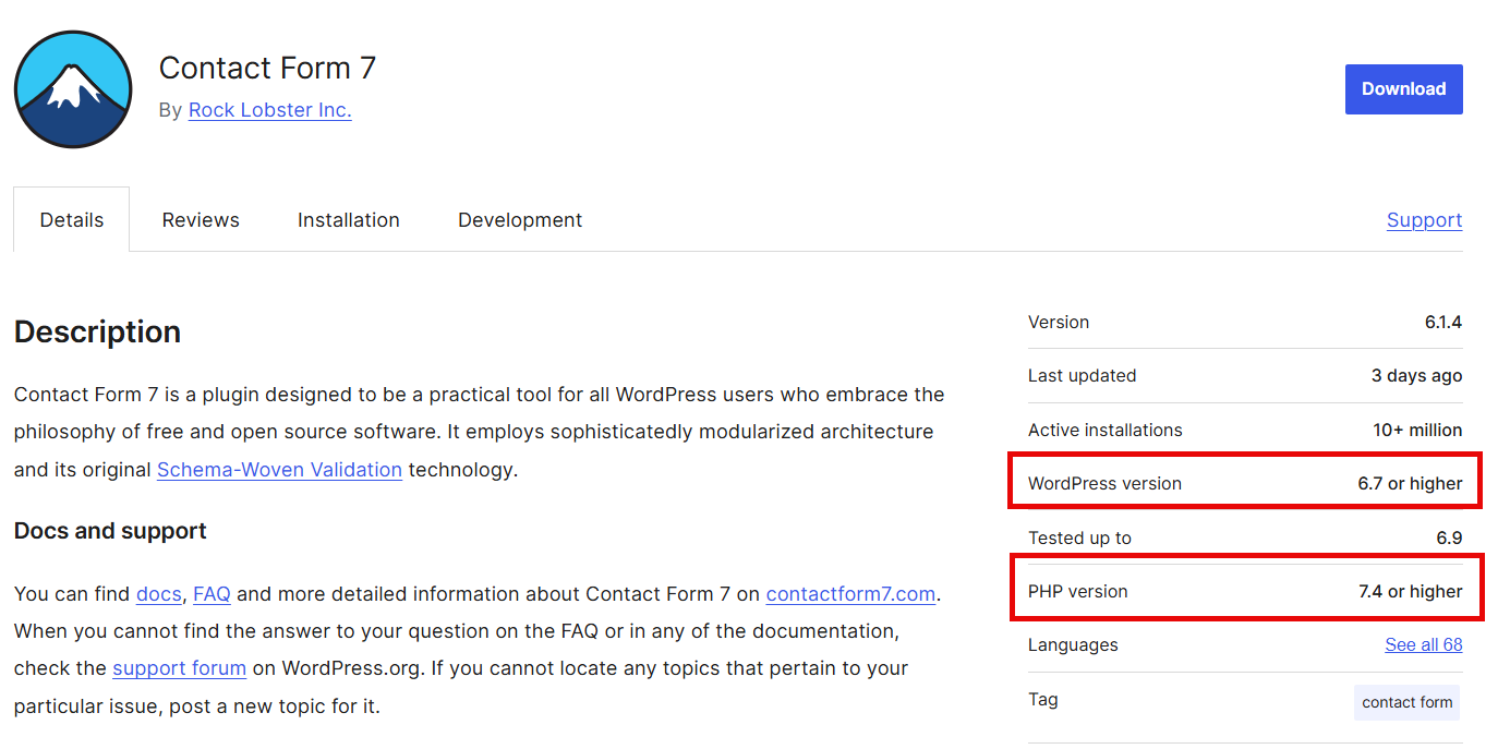 예를 들어, 현재 1,000만 개가 넘는 사이트에 설치되어 사용되는 인기 컨택트 폼 플러그인인 Contact Form 7의 경우 2025년 12월 기준으로 워드프레스 6.7 이상, PHP 7.4 이상에서만 최신 버전을 설치할 수 있습니다.