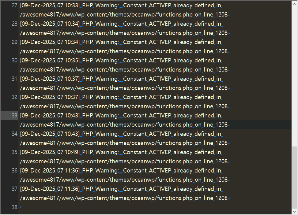 문제의 사이트에서 오류 로그를 체크해보니 다음과 같이 테마의 함수 파일에서 Constant ACTIVEP가 이미 정의되었다는 에러 메시지가 지속적으로 발생했습니다.