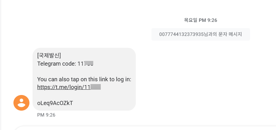 아래와 같이 0077744132373935 번호로 "[국제발신] Telegram code:... You can also tap on this link to log in..."이라는 문자가 왔습니다.