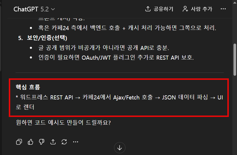 챗GPT에 카페24 쇼핑몰에서 워드프레스의 특정 카테고리 글을 가져와서 표시하는 방법에 대하여 물어보니 다음과 같이