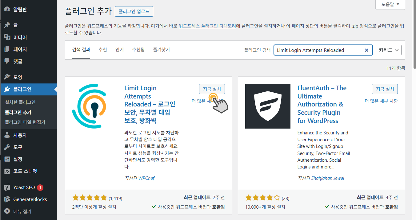 워드펜스(Wordfence)를 설치하지 않는다면 Limit Login Attempts Reloaded와 같은 플러그인을 사용하여 로그인 횟수를 제한하는 것을 고려해 볼 수 있습니다.