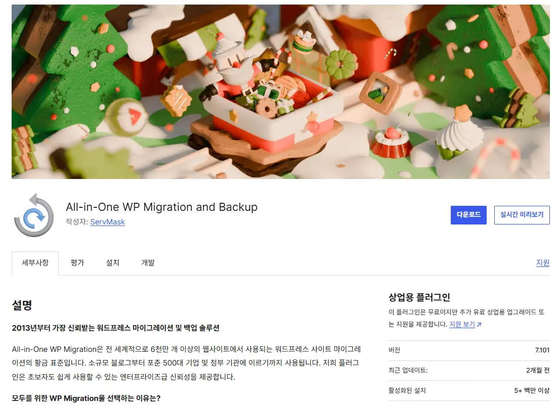 All-in-One WP Migration은 현재 500만 개 이상의 사이트에 설치되어 사용되는 인기 워드프레스 마이그레이션 플러그인입니다. 이 플러그인을 사용하여 사이트를 백업하고 추후에 복원할 수 있습니다.