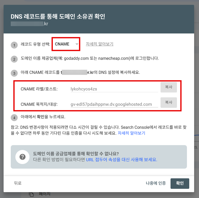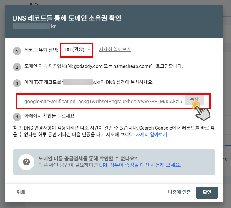 (3) DNS 레코드를 통해 도메인 소유권을 확인하는 화면이 표시됩니다. 기본적으로 TXT 레코드가 표시되며, 이 방식이 권장됩니다.