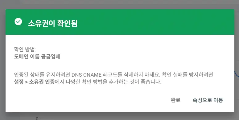 이 경우 한 두 시간(길어도 서너 시간) 정도 기다린 후에 다시 소유권 확인을 시도해 보시기 바랍니다. 정상적으로 소유권 확인이 되면 아래 그림과 같이 '소유권이 확인됨' 화면이 표시됩니다.