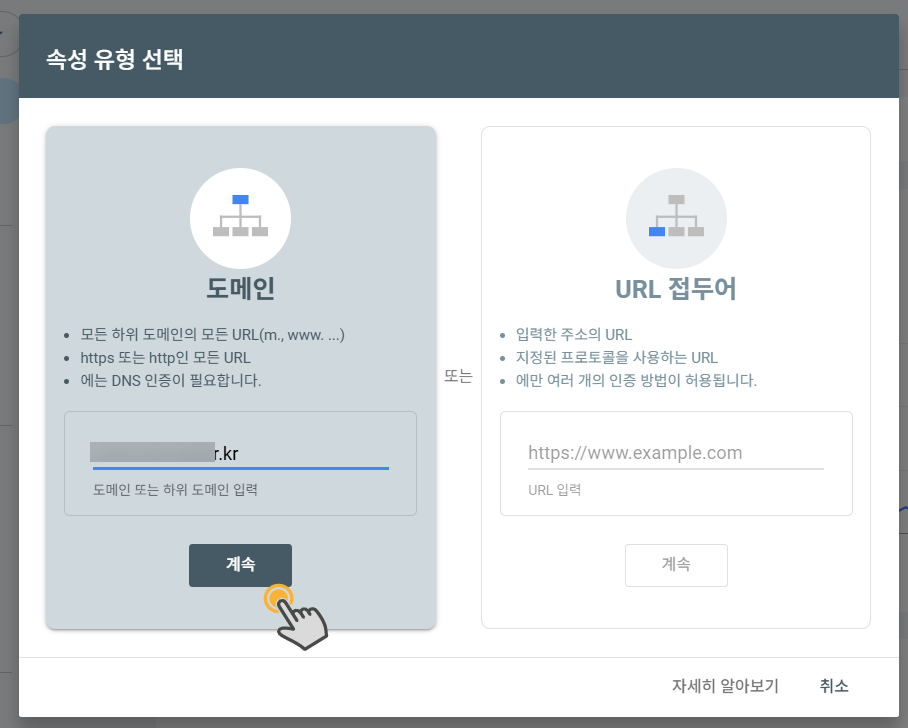 (2) 속성 유형 선택 팝업이 표시되면 도메인 방식과 URL 접두어 방식 중에서 선택할 수 있습니다. 두 속성 모두 추가하는 것도 가능합니다. 먼저 도메인 속성을 추가한 후에 URL 접두어 방식으로 속성을 추가하면 별도의 과정 없이 곧바로 URL 접두어 속성도 추가됩니다. (일반적으로 URL 접두어 방식으로 추가하면 HTML 파일을 사이트의 루트 폴더로 업로드하거나 HTML 메타 태그를 전면 페이지의 헤더 섹션에 추가하여 사이트 소유 확인을 할 수 있습니다.)