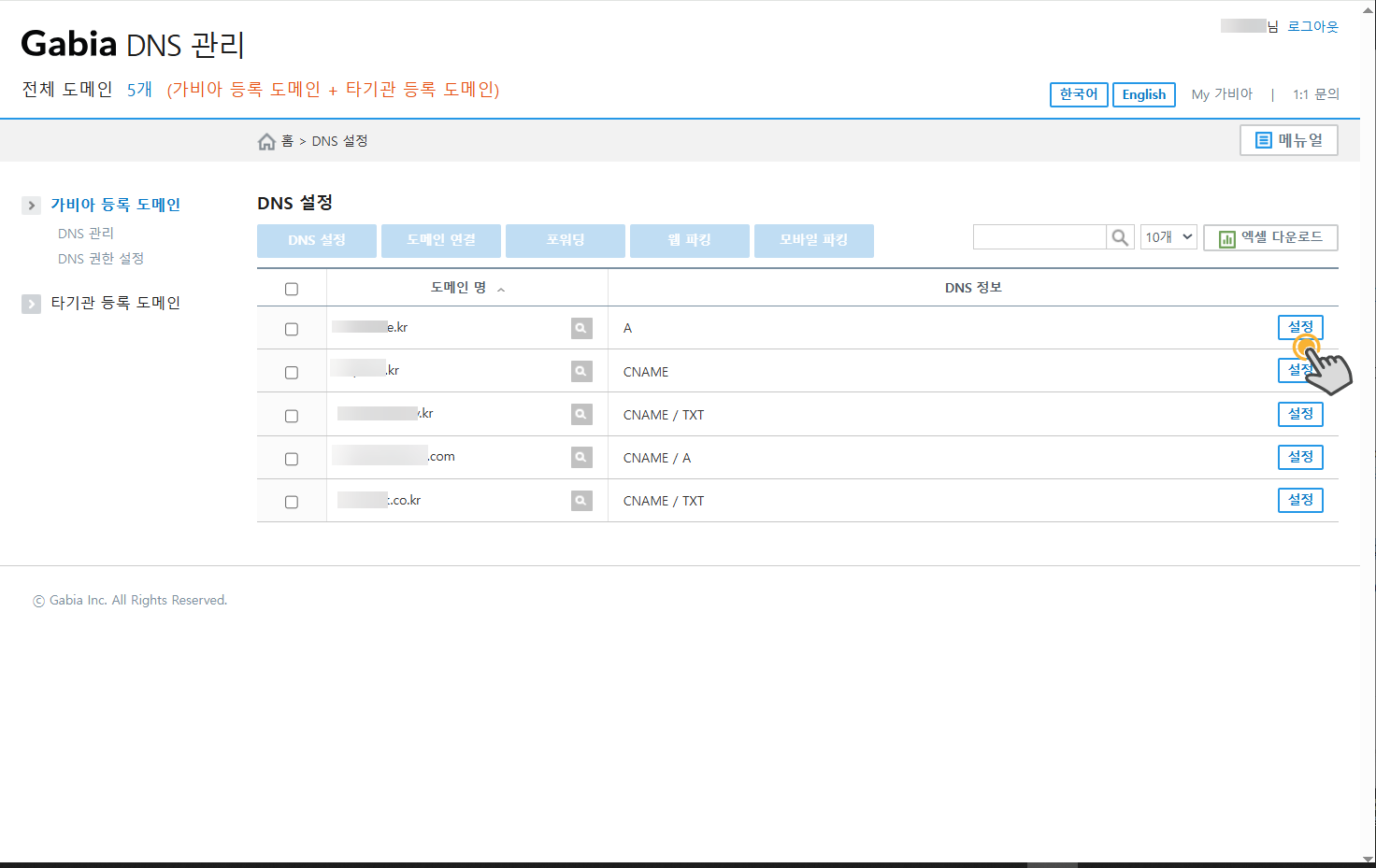 (6) DNS 레코드를 설정할 도메인의 맨 끝에 있는 설정 버튼을 클릭합니다.