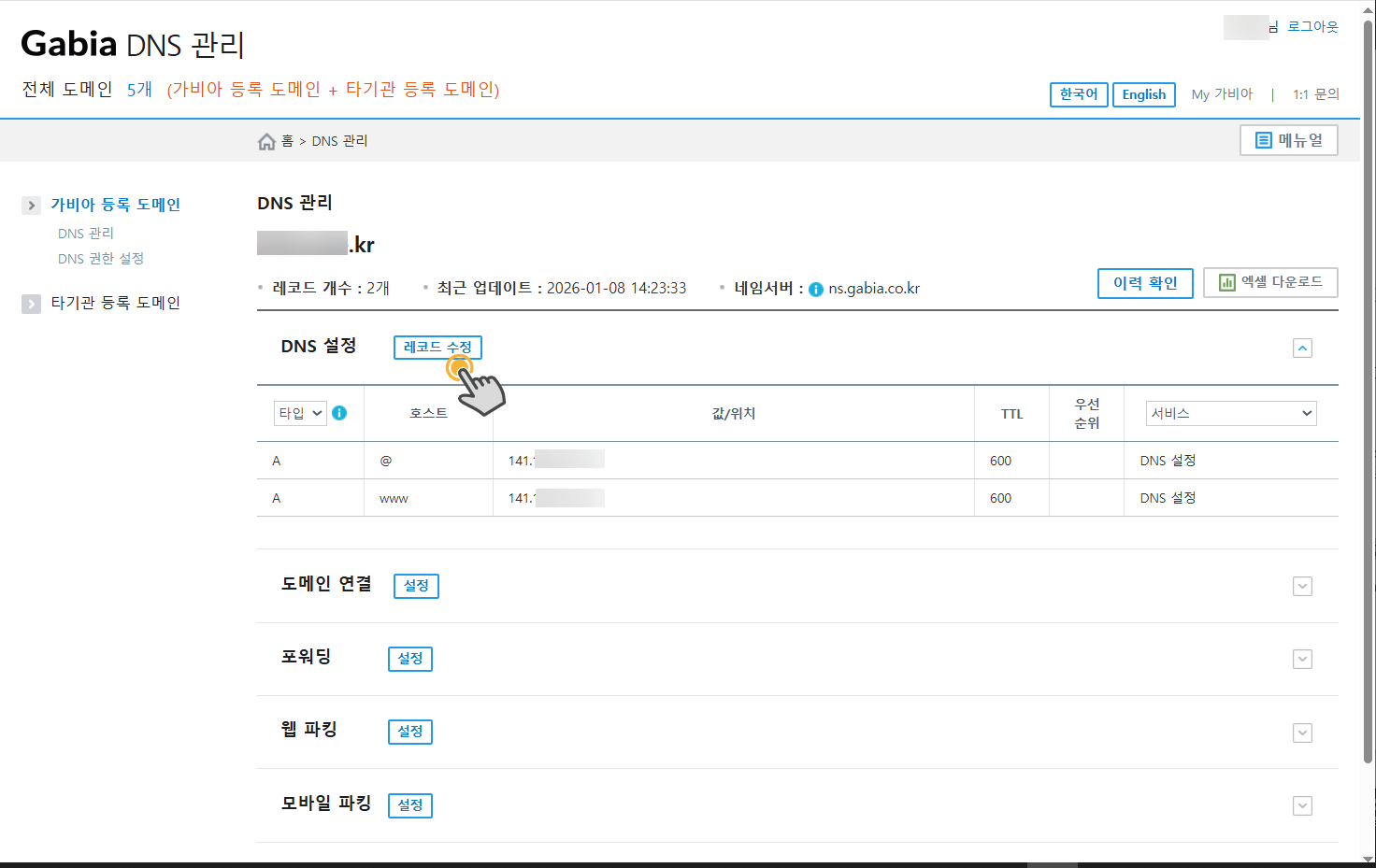 가비아 도메인 DNS 레코드 설정 방법 - 워드프레스 정보꾸러미