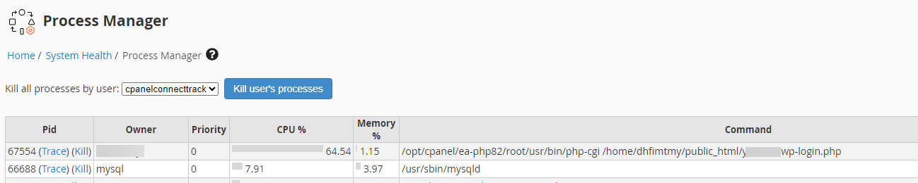 구체적으로 wp-login.php 프로세스가 CPU 사용률 64.54%를 점유하고 mysqld(데이터베이스) 프로세스도 CPU를 약 8% 정도 점유하고 있었습니다.