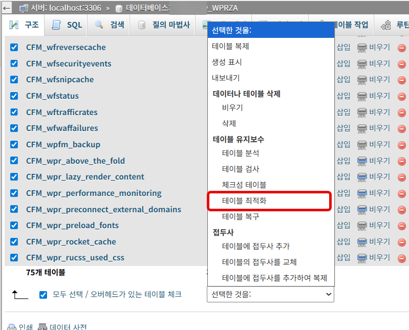 블루호스트의 안내대로 PhpMyaAdmin에서 테이블 최적화를 시도했습니다.