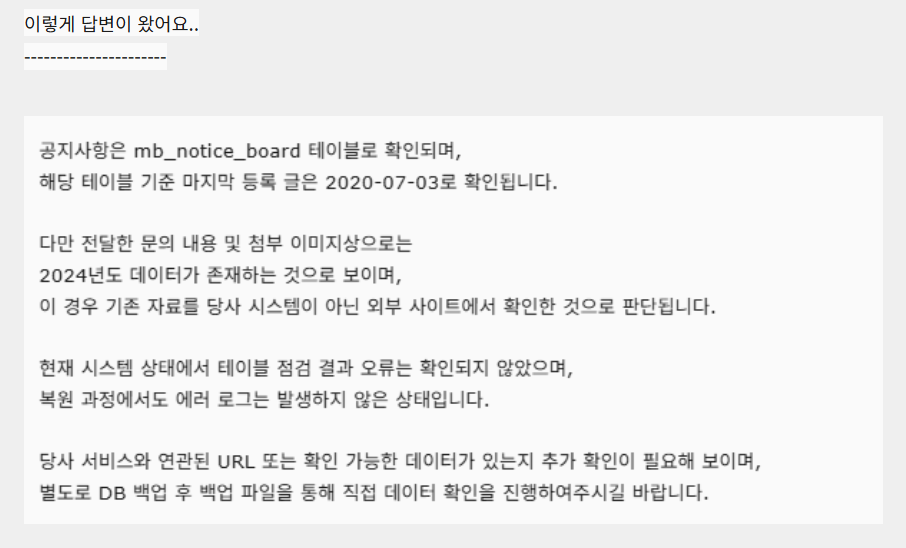 카페24의 답변에 의하면 공지사항 DB는 mb_notice_board 테이블로 확인되고, 해당 테이블 기준으로 마지막 등록 글은 2020년 7월 3일로 확인된다고 합니다. 하지만 사용자가 전달한 이미지(온라인 아카이브에 저장된 망보드 게시판 데이터를 백업한 이미지)상으로는 2024년도 데이터가 존재하는 것으로 보이지만 기존 자료를 카페24 시스템이 아닌 외부 사이트에서 확인한 것으로 판단된다는 답변을 했습니다.
