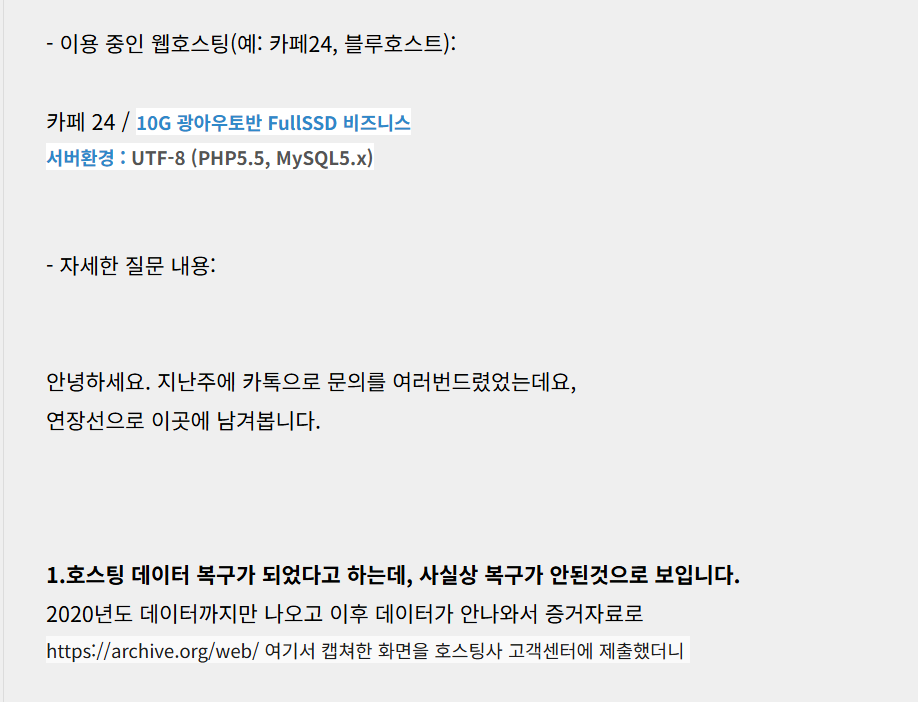 아래는 카페24 데이터 복원과 관련하여 네이버 카페에 올라온 질문을 캡처한 것입니다.