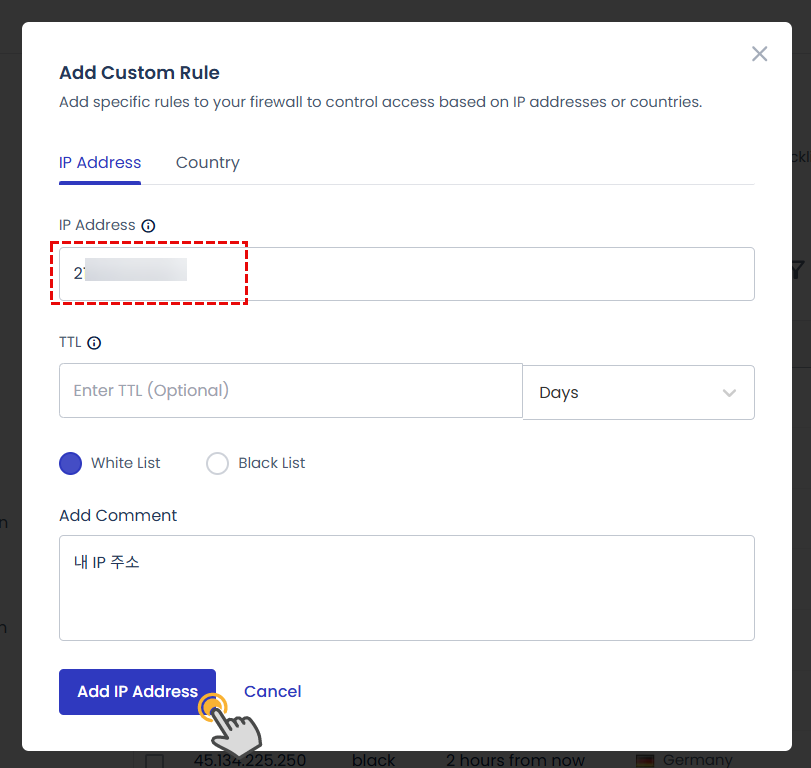 이 방법으로 특정 IP 주소를 허용하거나 차단할 수 있습니다. 또한, 특정 국가 전체를 차단하는 것도 가능합니다.