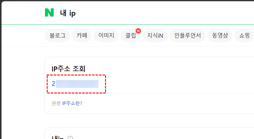네이버에서 '내 ip'로 검색하면 내 인터넷 회선의 공인 IP 주소가 표시됩니다.