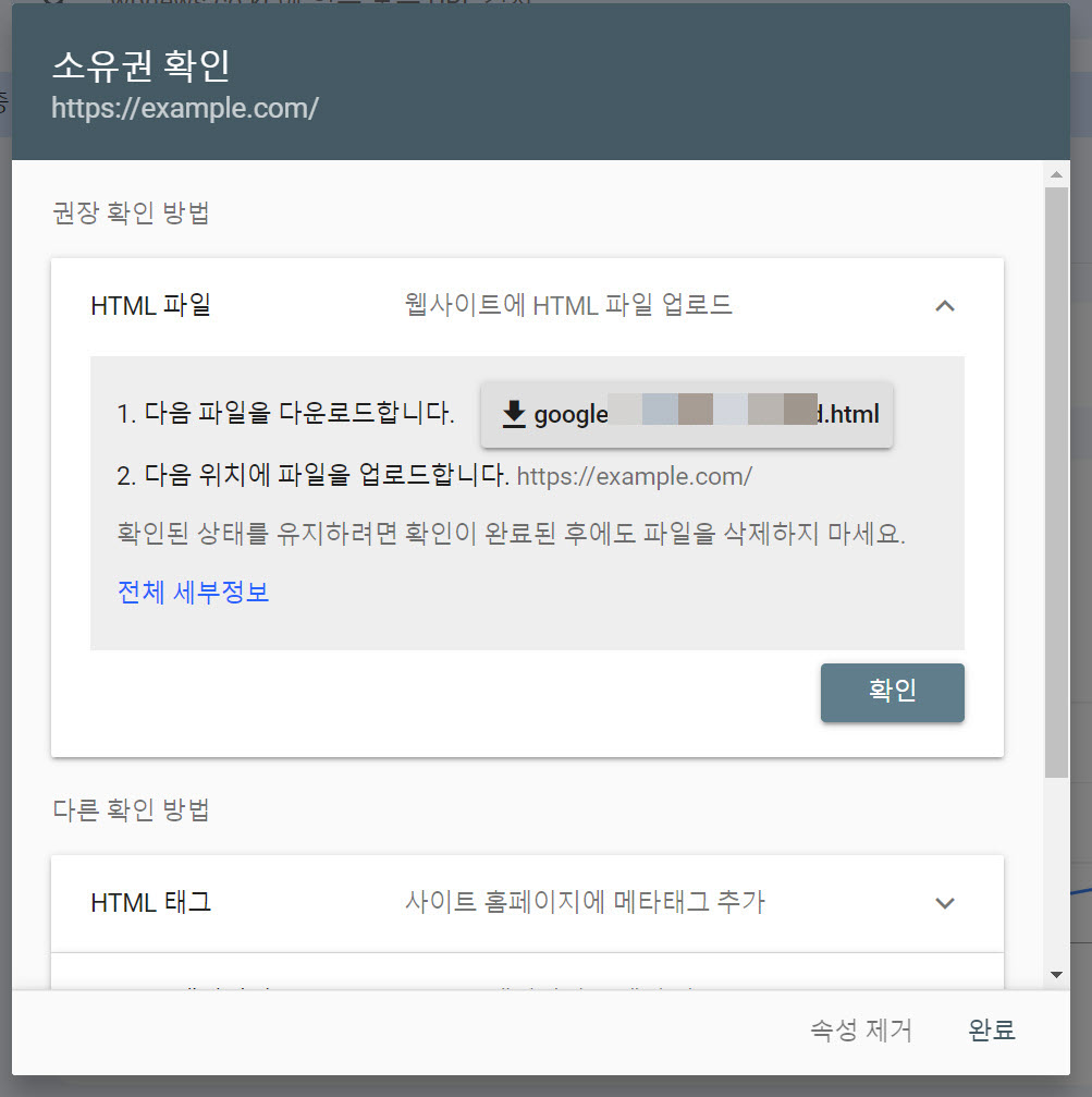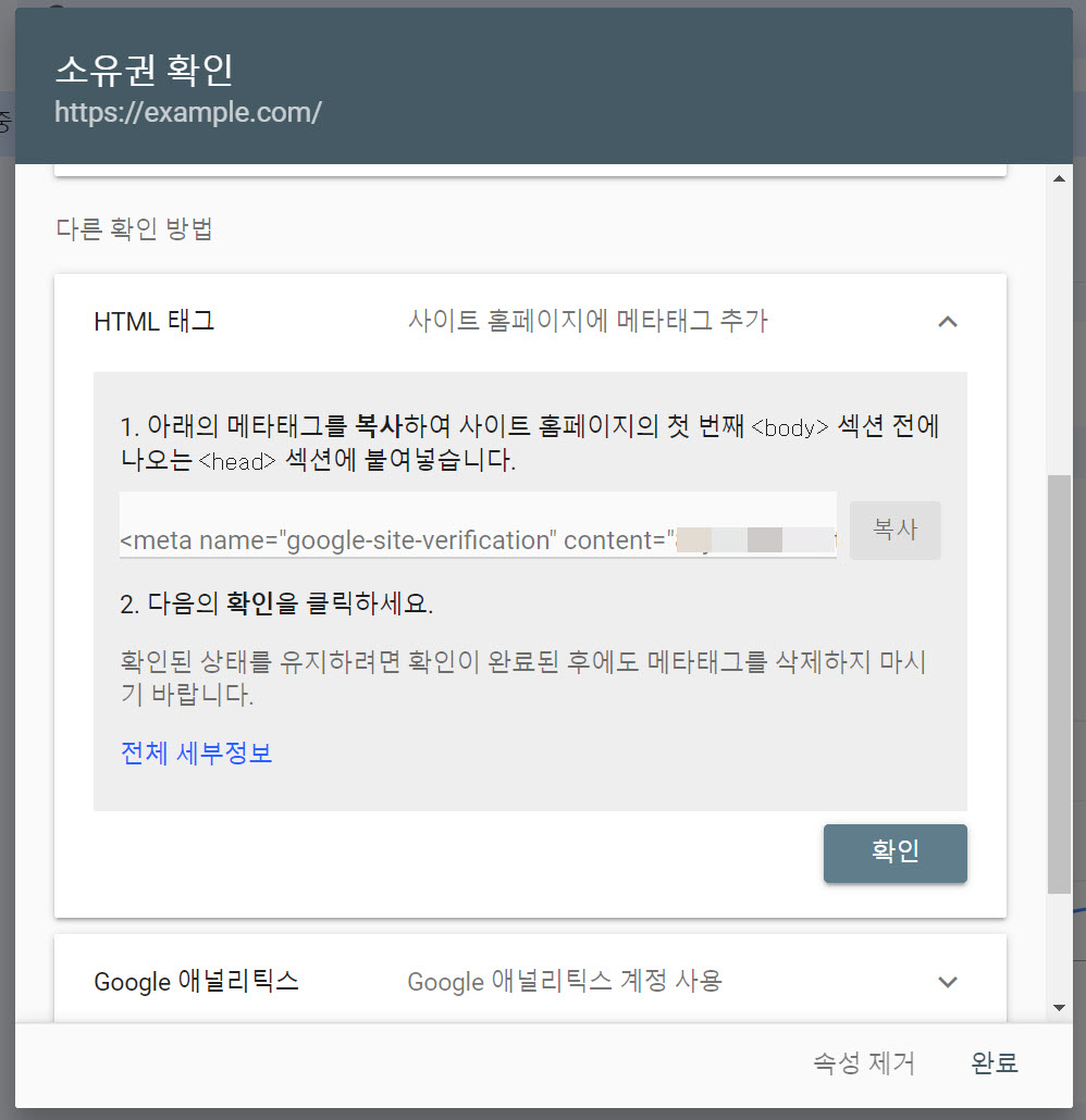 이외에도 구글 애널리틱스, 구글 태그 관리자 등의 방법을 이용하여 사이트 소유를 인증할 수 있습니다.