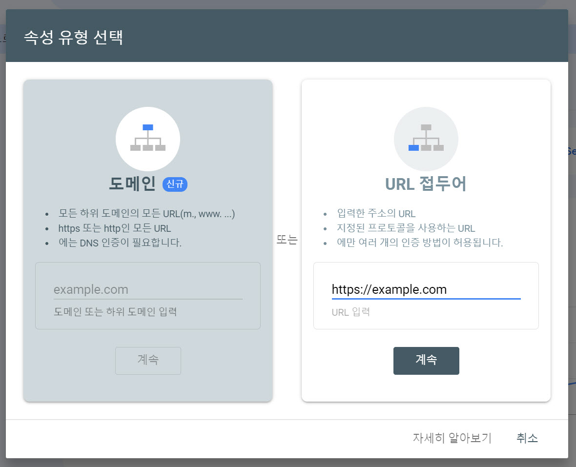 그러면 사이트 소유권을 인증(확인)하는 화면이 표시됩니다. 속성 유형 선택 화면에서 도메인 방식과 URL 접두어 방식을 선택할 수 있습니다.
