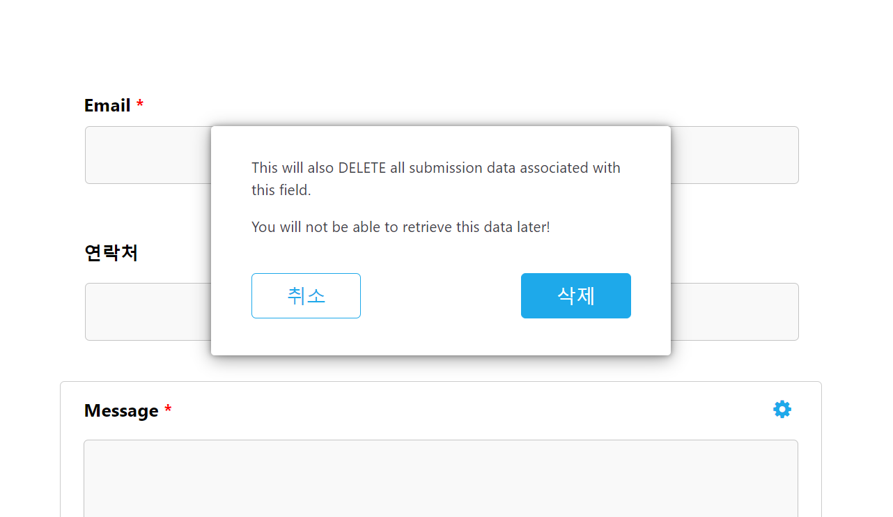 필드를 삭제하면 이 필드와 관련하여 제출된 모든 데이터도 삭제된다는 경고가 표시됩니다.