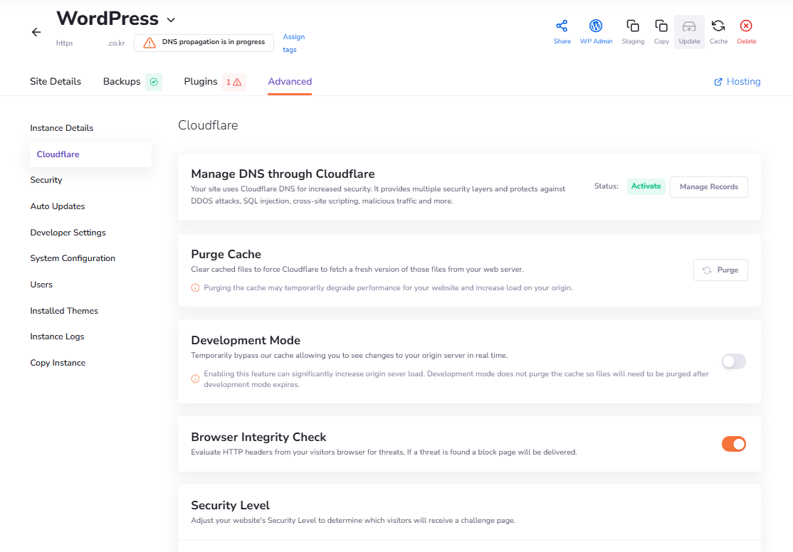 Advanced 탭에서 Cloudlfare CDN 캐시를 삭제하고 보안 레벨을 변경하는 등의 작업을 할 수 있습니다.
