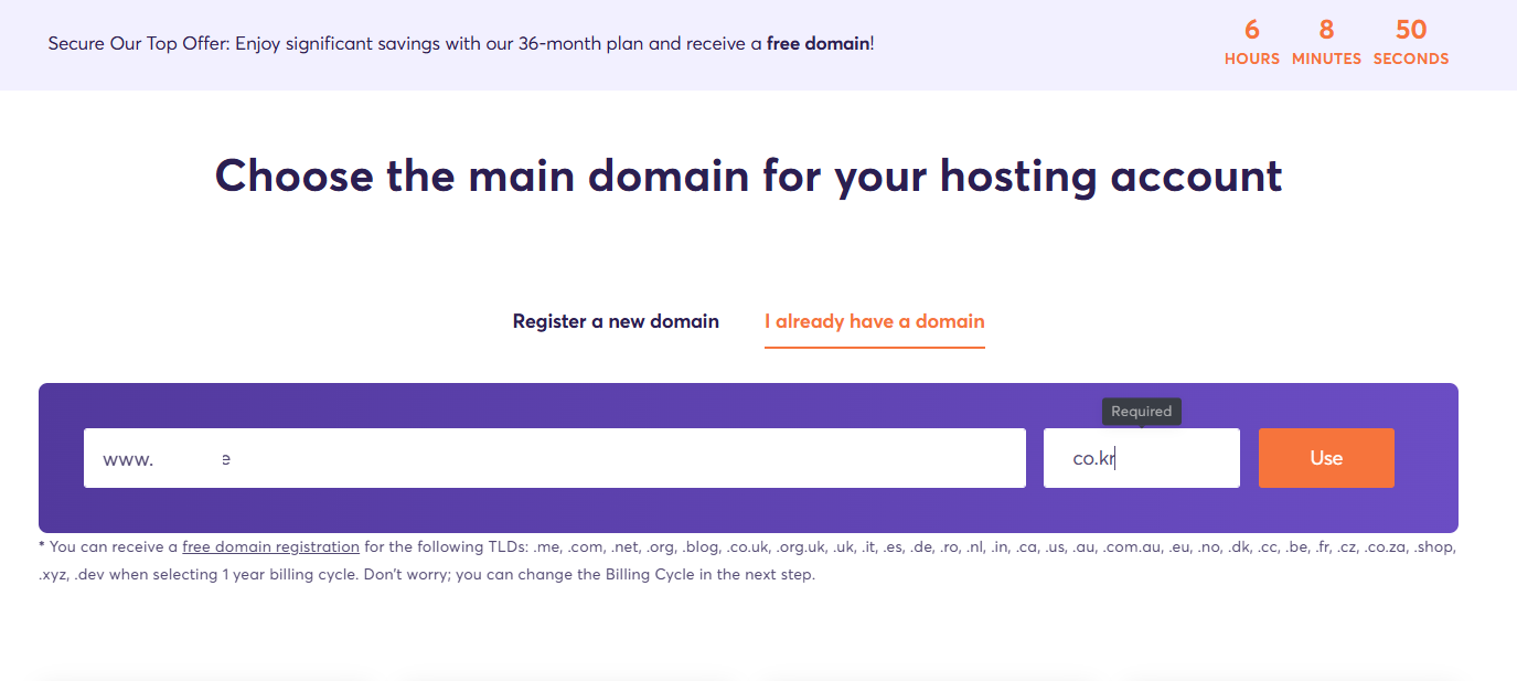 도메인 선택 화면에서 새 도메인을 등록할 것인지, 아니면 기존에 사용 중인 도메인을 사용할 것인지 선택합니다. 12개월 요금제를 선택하는 경우 무료 도메인이 제공된다고 합니다.